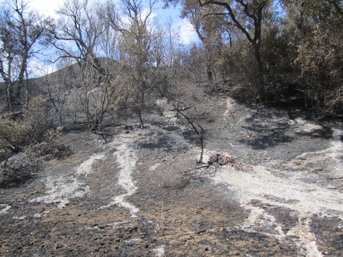 The ghosts of fallen trees (see white areas on ground). These trees fell prior to the fire and had been dead for some time. The large dead trunks burned hot and produced white ash, marking the location of the fallen trees on the ground. Taken May 6, 2013
