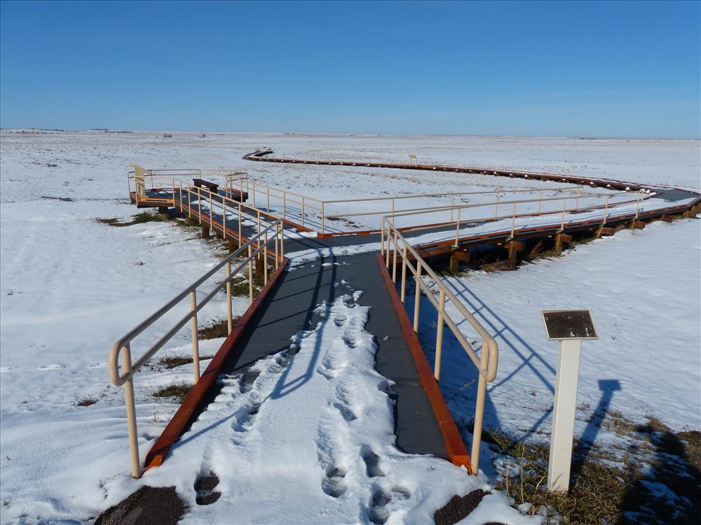 Park crews rehabilitating Prairie Winds Trail, by removing deteriorated wood decking, reducing the trail width from eight feet to six feet, installing 4,680 sqaure feet of recycled plastic lumber, 1,183 linear feet of wood edge boards, re-finishing 244 linear feet of metal hand rails to complete this accessible trail.