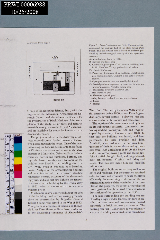 HISTORY. BLACK AMERICANS. 1985. ALEXANDRIA SLAVE PEN. 4+ PAGES.<CRFAIRFAX CHRONICLES. ALSO THE FALLS CHURCH COLORED SCHOOL.<CRPHOTOCOPY. BY ARTEMEL, PARKER & RAMOS.<CR<CR<CRCATALOG # ON BACK. GLOVES FOR HANDLING.