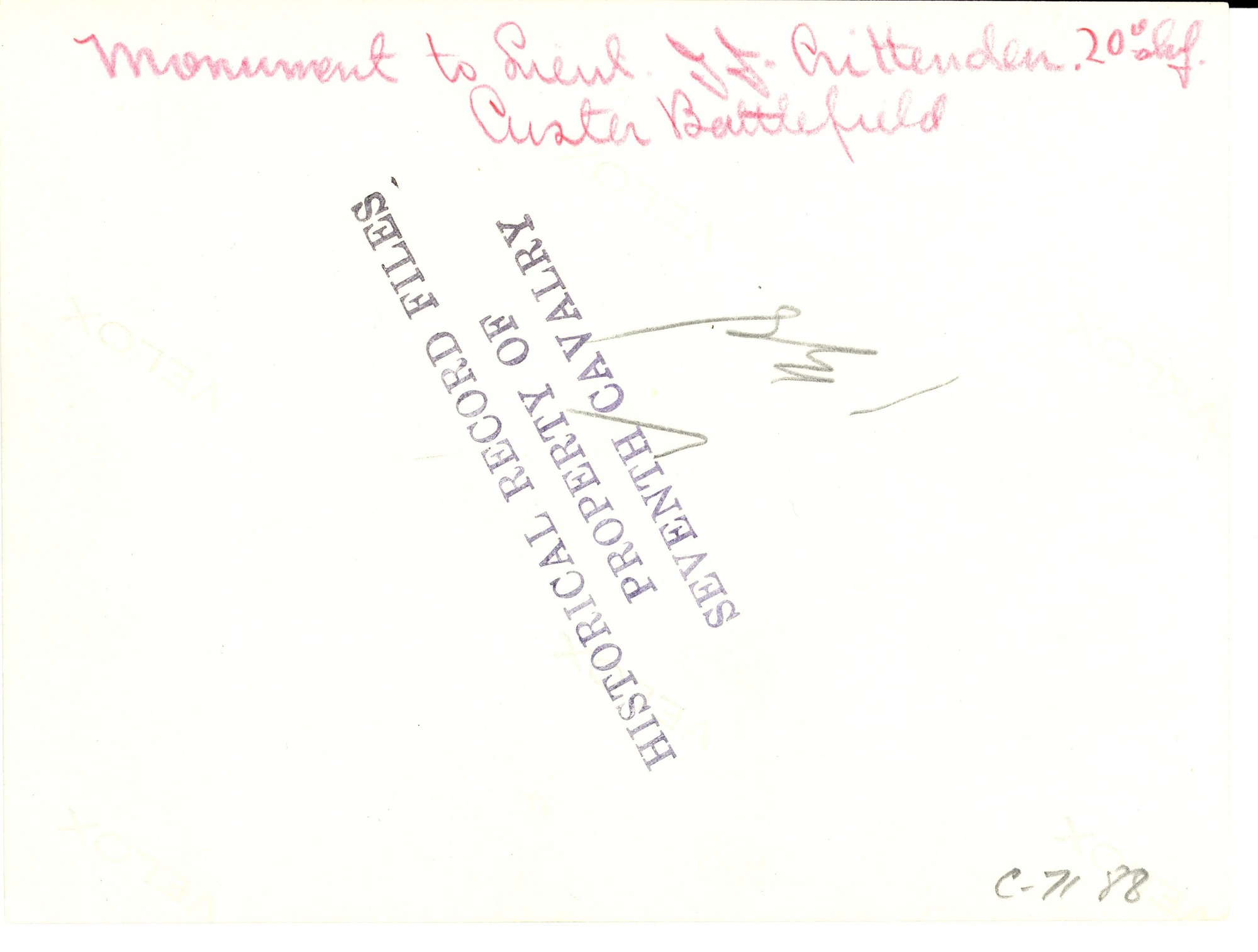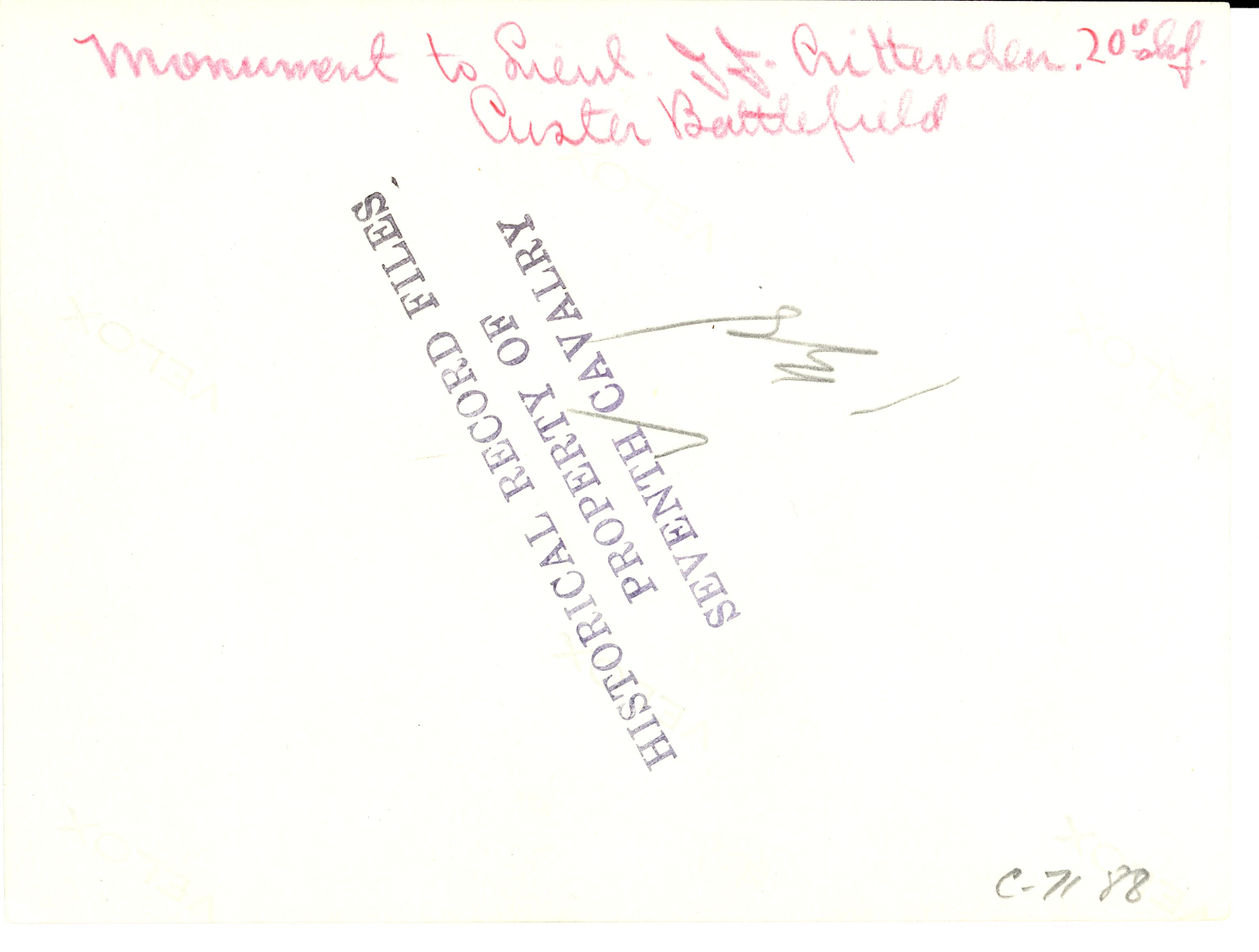 LIBI_00011_07188; A black-and-white photograph of Lieutenant Crittenden's marker; handwritten ink notation reads, "Monument Lt. Crittenden. 20 inf. Custer Battlefield"; created by unknown photographer, on unknown date.; PRINT, PHOTOGRAPHIC; Courtesy of the National Park Service, Little Bighorn Battlefield National Monument, LIBI_00011_07188, Unknown Photographer, "Lieutenant John J. Crittenden's Marker," date unknown.