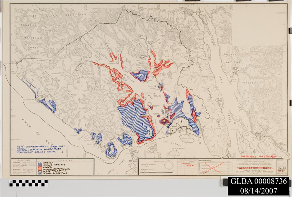 Master Plan for Preservation and Use of Glacier Bay National Monument. 18 pages including maps and text with blue and red ink corrections.