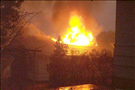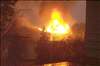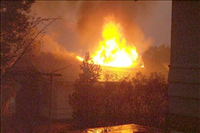 Night photos of a house burning during the Long Mesa fire in Mesa Verde National Park, July-August 2002