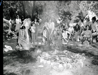 Cooking acorn mush at the Roundhouse Dedication, Yosemite Valley. Craig Bates lifting cooking stones from fire on right, woman cooking acorn mush (L to R): Lucy Parker, (standing Felicia Espina), Kimberly Stevenot, (back to camera, Julia Parker) partially