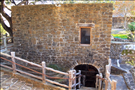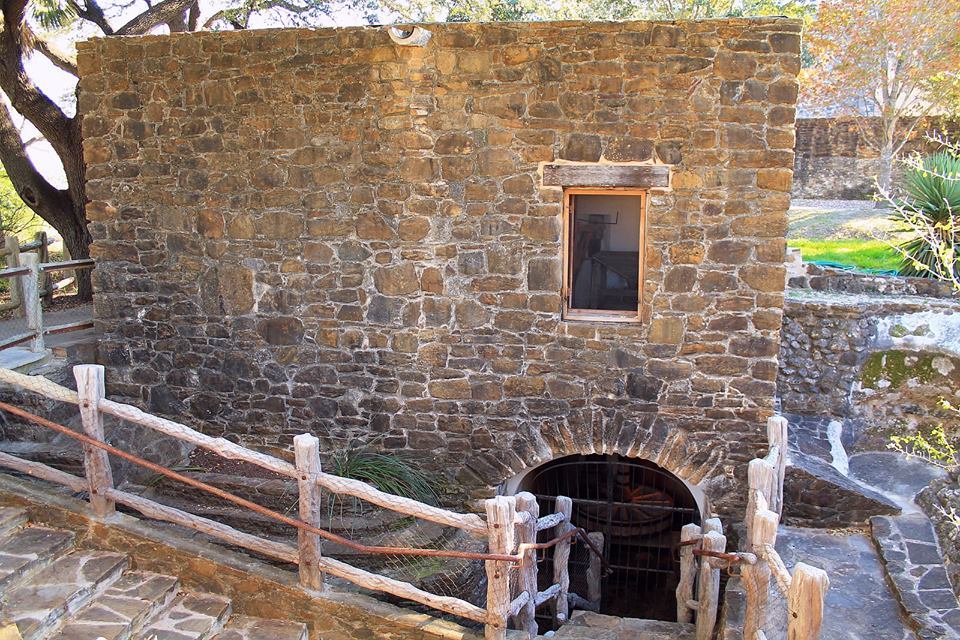 Just outside the walls of San Jose Mission stands the oldest water-powered mill in Texas. It was built in 1794, at about the same time as the original Pawtucket Canal was being dug in Lowell), and restored in the 1930s. Water was channeled from the acequia (i.e., canal) and dropped down a chute to pour onto a horizontal waterwheel, visible at the bottom right of the photo. The wheel turned a shaft connected to a millstone that ground wheat, visible through the window. The mill could grind 600-800 pounds of wheat every day!