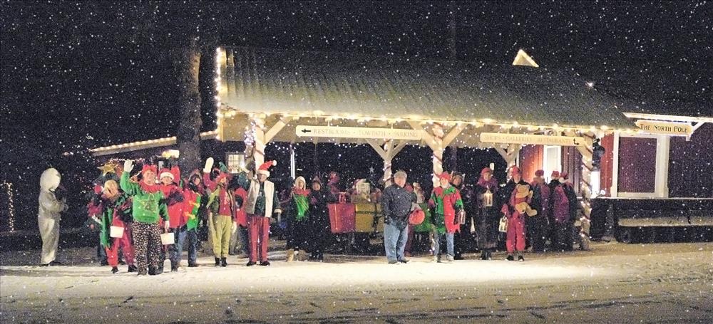 Costumed volunteers wave to the incoming Polar Express train. || Each winter Cuyahoga Valley National Park and Cuyahoga Valley Scenic Railroad present The Polar Express, a holiday program based on the book by Chris Van Allsburg. Thousands of children clad in pajamas board the train in Independence and Akron, Ohio to travel with merry elves to the North Pole. At the North Pole, children look out the windows to see volunteers dressed as holiday characters and are joined on the train by Santa.