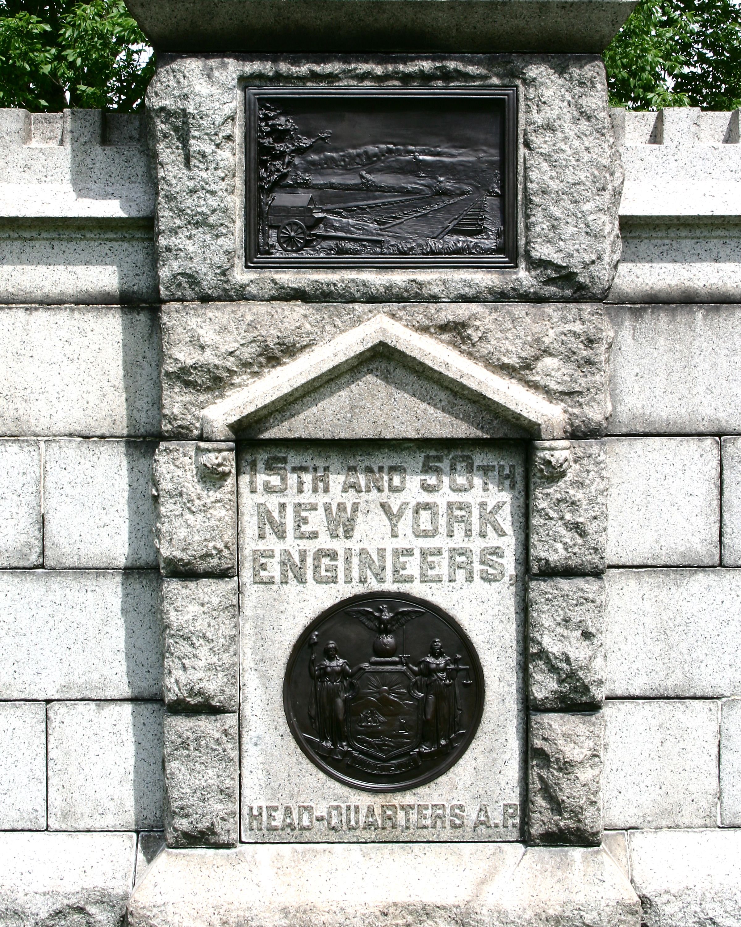 1 of 90 Monuments to New York. Indicates participation in Gettysburg campaign though not present during battles, laid pontoons over Rappahannock & Monocacy Rivers June 1863 to facilitate troop movements. Located N side Pleasonton Avenue. || Mn base 14'3"x4'9", Minature Corps of Engineers castle. Composed of coursed, rough-cut & laid granite w/ bronze medallions, tablets, bas-reliefs & excised inscriptions. All 12' high.