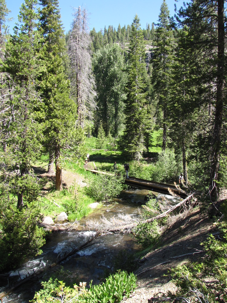 View from above of a wooden bridge over Hot Springs Creek in a meadow and forest area in Warner Valley.