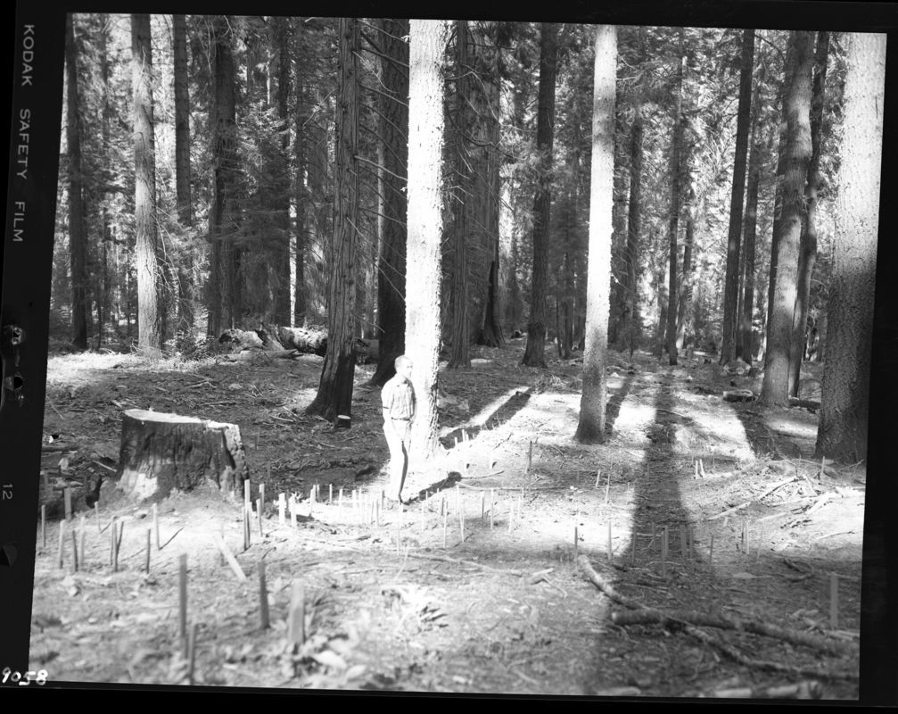 Unknown Photographer, Unknown Date, Redwood Canyon, KCNP, Research Activities, Dr. Howard S. Shellhammer, stakes indicate small Sequoia seedlings growing in soil disturbed in one of the research areas.