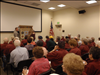 A group of volunteers sit in a room watching the unveiling of a quilt.