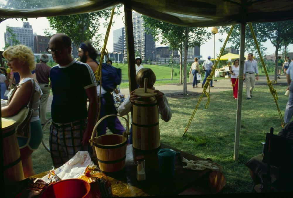 Crowd in a craft tent. ; August 1982
