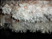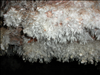 Frostwork is made of calcium carbonate (just like calcite); however, it has a different internal crystalline structure. When the crystals are large, you can distinguish the crystal habit of aragonite from calcite. Aragonite has long, acicular (needle-like) crystals while calcite tends to be stubby and rhombohedral. Bushes of this acicular aragonite crystals are known as frostwork. A process known as 'magnesium-poisoning', coined by geologist Robert Folk, describes the phenomenon by which certain solutions supersaturated with calcite are eventually prohibited from precipitating calcite due to high magnesium concentrates! Magnesium somehow interferes with the lateral growth of calcite crystals but not aragonite. Basically, evaporation drives up the concentration of ionic species. As calcium is lost to precipitation, the magnesium-to-calcium ratio increases until calcite growth is inhibited (at about 2.9:1). Thus, aragonite is deposited after this point. This is why you see a common progression of calcite to aragonite precipitates due to evaporative enrichment.