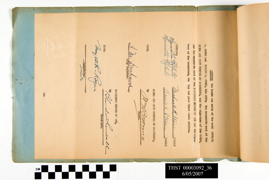 Sales contract between the Baltimore Museum of Art and Michael and Bessie Stone, type written, two grommets at top, multiple pages in blue cover, page 1