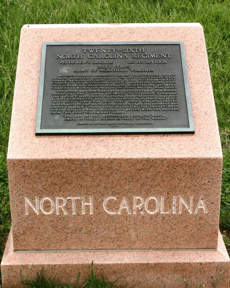 1 of 2 Monuments to North Carolina. Indicates farthest advance position reached July 3, 1863 during Pickett's Charge, having reached the stone wall, forced to retire due to heavy losses. Located near the Angle. || Pink granite monument w/bronze narrative plaque. Concrete base 4'5"x4'11" Granite base 2'8"x3'0"x8"H. Monolithic sloped face shaft 2'8"x2'4"x2'8"H. All 3'4"H. Bronze plaque 1'8"x2'0".