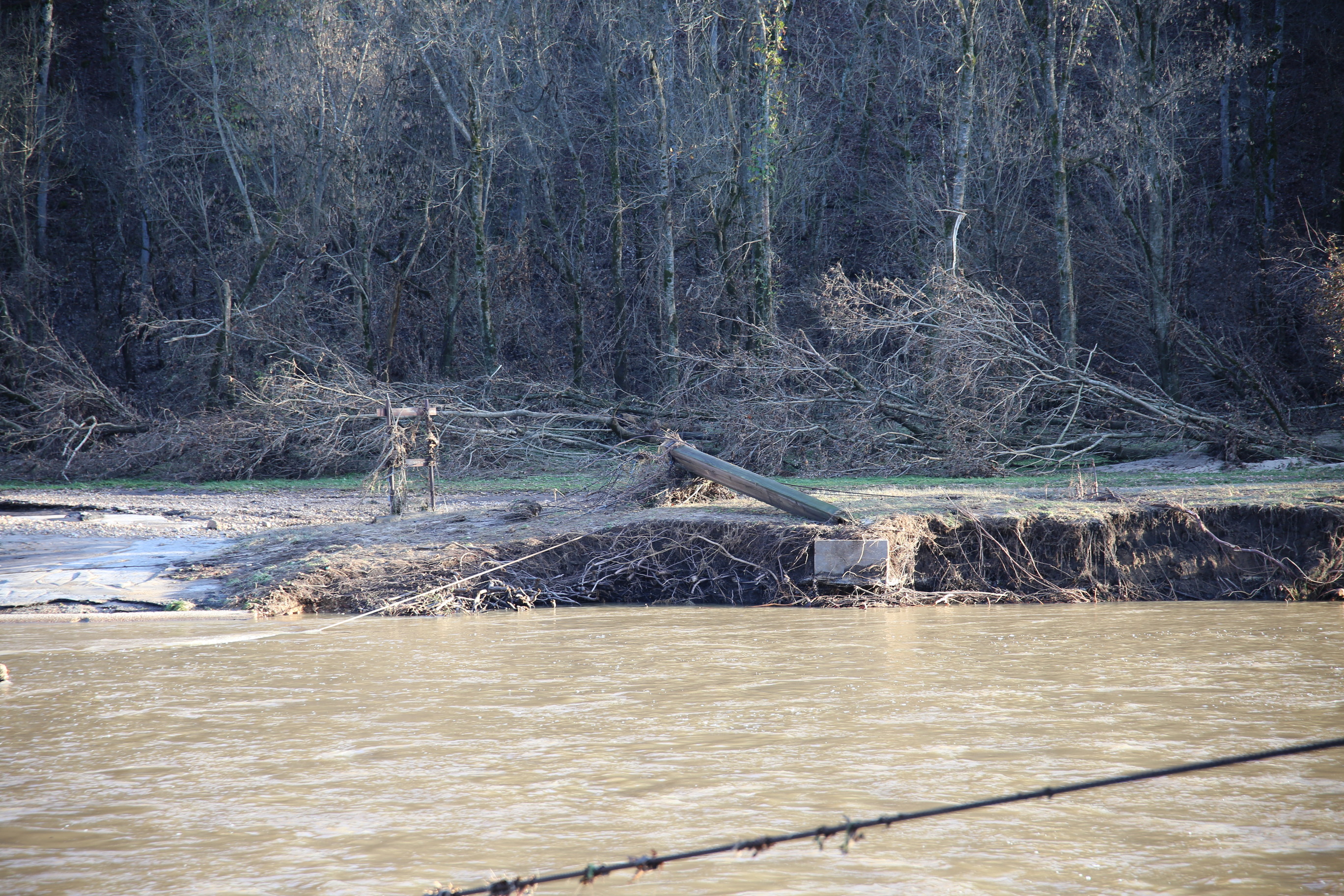 One of the pillars holding the ferry cable has been broken from its base, leaving the line to drag in the water.
