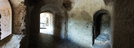 panoramic view of interior baptistry with window to the right, passageway ahead, and dark staircase to the right
