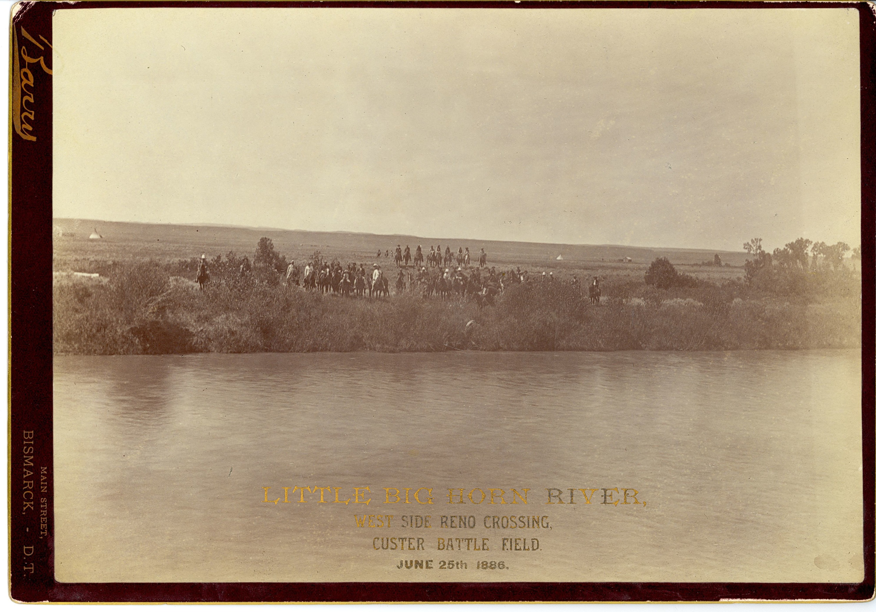 LIBI_00019_00425; This item is an original albumen photograph of horsemen gathered on the west side of the Little Big Horn River at Reno Crossing. The photograph is 6 7/8 x 9 7/8" mounted on brown card with gilded gold or bronze along all 4 edges. The card photograph was produced at on unknown date by David F. Barry. On the front, a typed caption embossed in gold or bronze ink reads, "Little Big Horn River/West Side Reno Crossing/Custer Battle Field/June 25th, 1886." The photographer's stamp is printed on the left side of the image. On the verso, a handwritten notation in pencil reads, "Col. Reno with 7th Cavalry, Dakota." Handwritten description provided by Elizabeth B. Custer.Note: "Pkg 8" handwritten on the verso.; Print, Photographic [Mounted on Card]; Courtesy of the National Park Service, Little Bighorn Battlefield National Monument, LIBI_00019_00425, D. F. Barry, "Horsemen on the West Side of Reno Crossing," June 25, 1886
