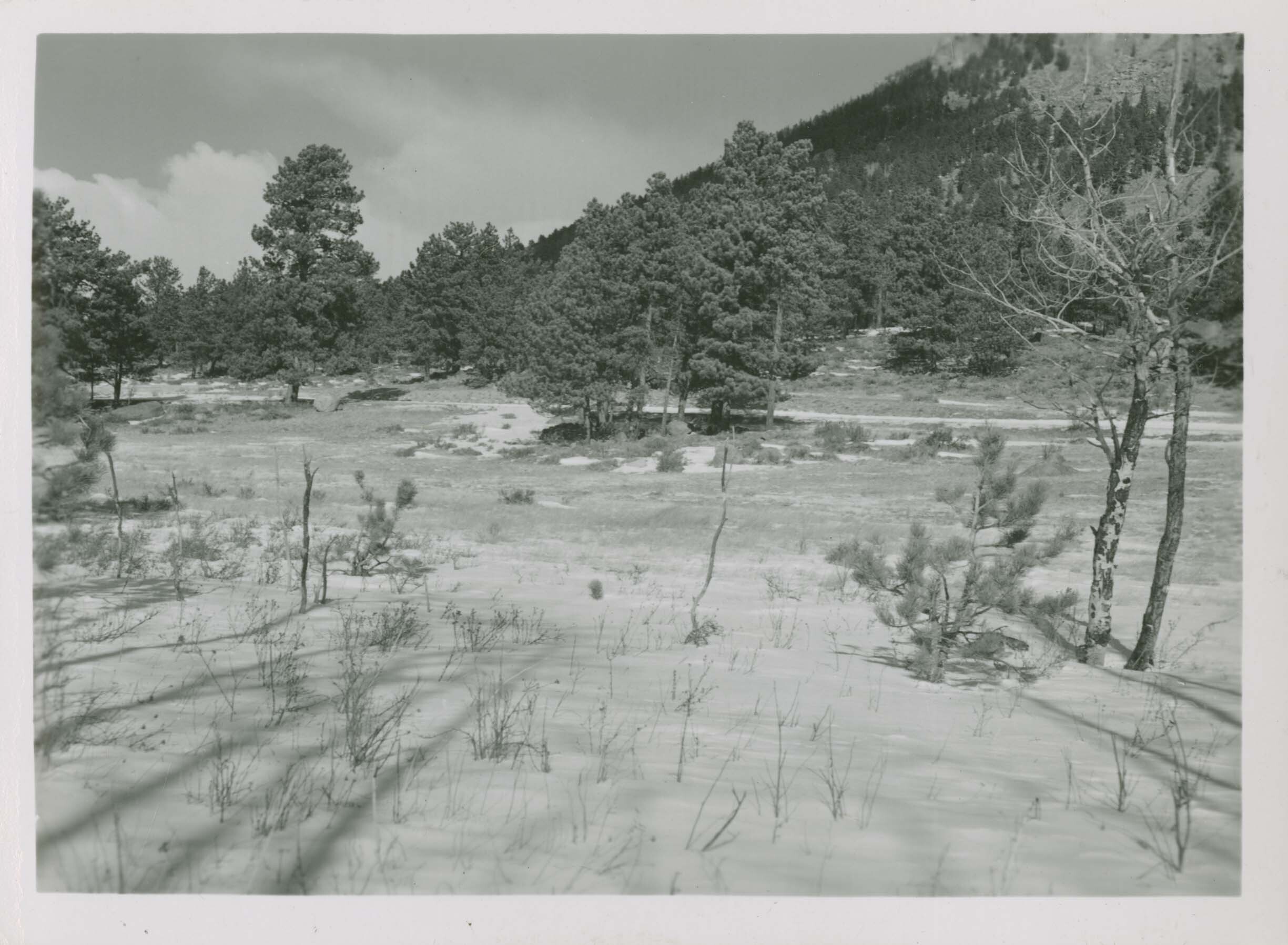 Young yellow pines killed or malformed by deer. Large pines "high-lined". . Locality: East end of Beaver Meadows, Rocky Mountain National Park. Negative #: 11519