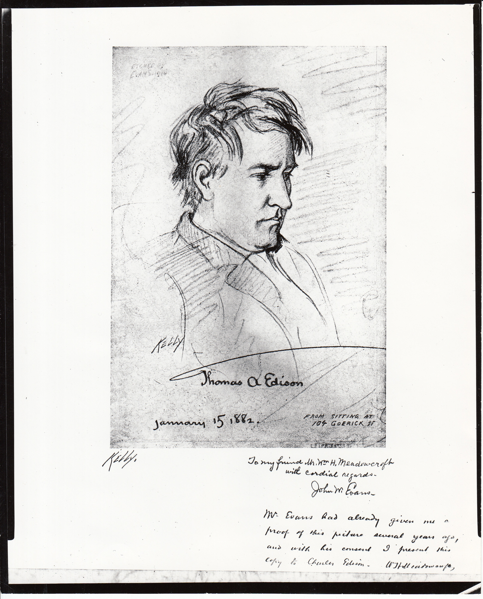 Rendering of Thomas Edison by J.E. Kelly. Rendering done January 15, 1882 by Kelly and engraving/etching done 1914 by John W. Evans. Text on rendering reads: "Etched by Evans 1914" ; "Kelly / January 15, 1882 / From Sitting at 104 Goerick St."; Inscriptions below etching read: "To my friend Mr. Wm. H. Meadowcroft with cordial regards. John W. Evans." / "Mr. Evans had already given me a proof of this picture several years ago, and with his consent I present this copy to Charles Edison. W. H. Meadowcroft."