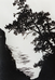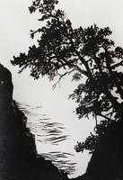 A black-and-white image made by printing ink on paper. At the top and middle of the image, a black tree is silhouetted against a white sky. Down and to the left of the tree, a black cliff stands above a canyon. Black lines flow off of the cliff, mimicking the flow of mist and fog after rain.