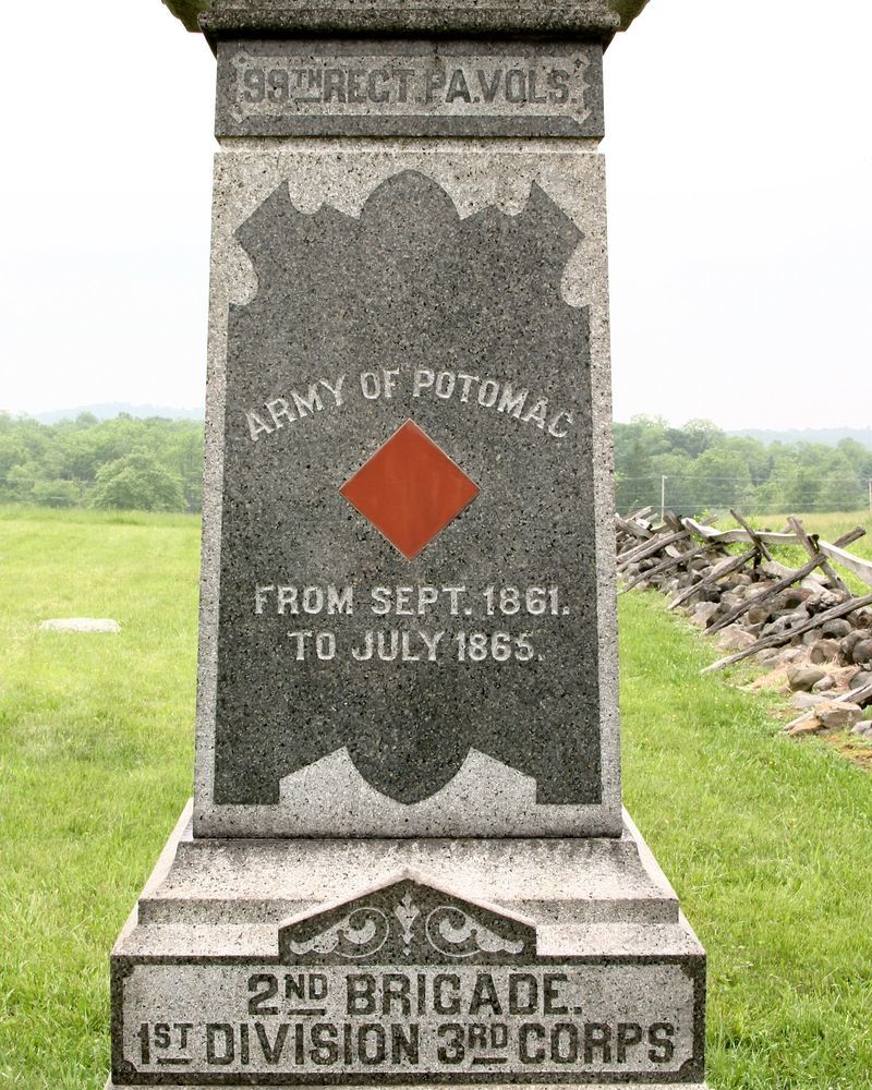 1 of 110 Monumnents to Pennsylvania. Indicates position held by 99th PA Infty July 3, 1863. Located E side Hancock Ave. || MN comprised of base, 3 part shaft, 2 part cap. Base 4'-2" sq. shaft of smooth & polished granite, alternating excised & incised lettering. Cap of cyma reversa, ogee, segmental arch, pryamidal cap. Chip in base, some stone staining.