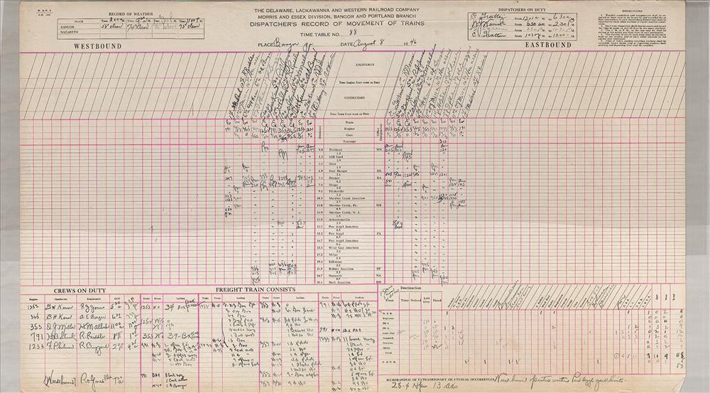 Dispatcher Sheets--Bangor & Portland Branch--Delaware, Lackawanna & Western Railroad [1946.08.01-1946.08.17]
