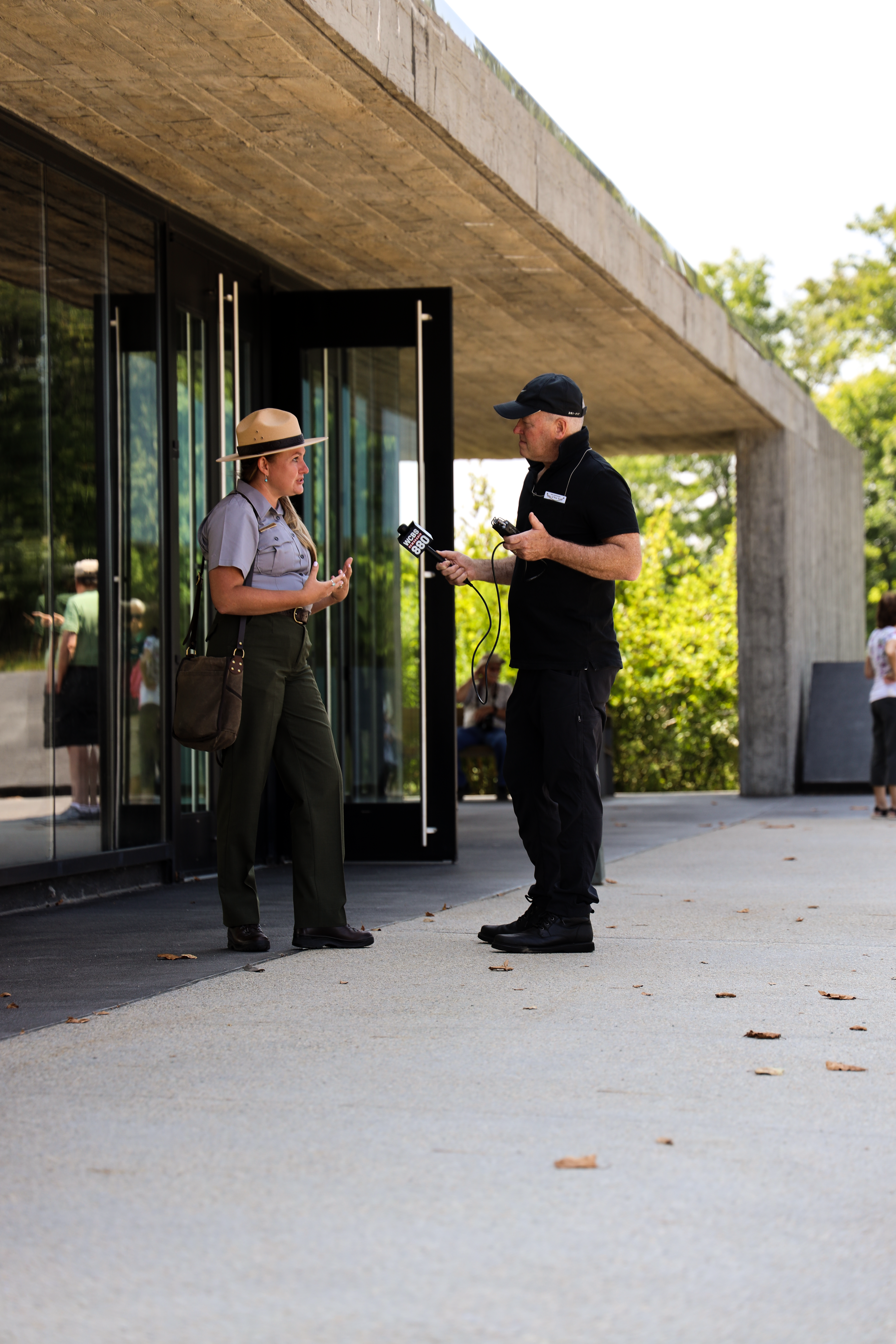 Flight 93 Park Ranger Katie speaking to a reporter at the Visitor Center located at the Memorial Plaza.