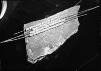 Titled: "Clamshell beads ready for grinding on rock." Set up by C. Brown (for movie "Yosemite Indians"). Probably more typical of Pomo culture than Miwok.