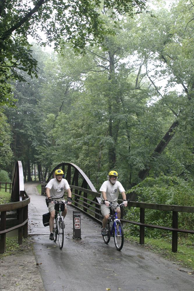 At Cuyahoga Valley National Park volunteers perform a wide variety of duties during every season of the year. Currently over 2,021 volunteers donate over 70,195 hours to the park. || Trailblazer volunteers assist the park by patrolling the Towpath Trail in pairs on bicycle. These volunteers are riding just north of Hunt Farm.