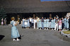 The famous employee sing-away ceremony - as visitors leave the Grand Canyon Lodge, on the North Rim of Grand Canyon National Park. Circa 1960. NPS photo by Jackson. For decades the college-aged employees of the Grand Canyon Lodge would greet visitors arriving by bus and sing them through the entrance. These same employees would later entertain with a talent show after serving dinner, and end the evening with a dance complete with a college student orchestra. When it came time for the guests to depart, the employees would sing the buses away. These entertainments no longer exist. Photo circa 1960. .