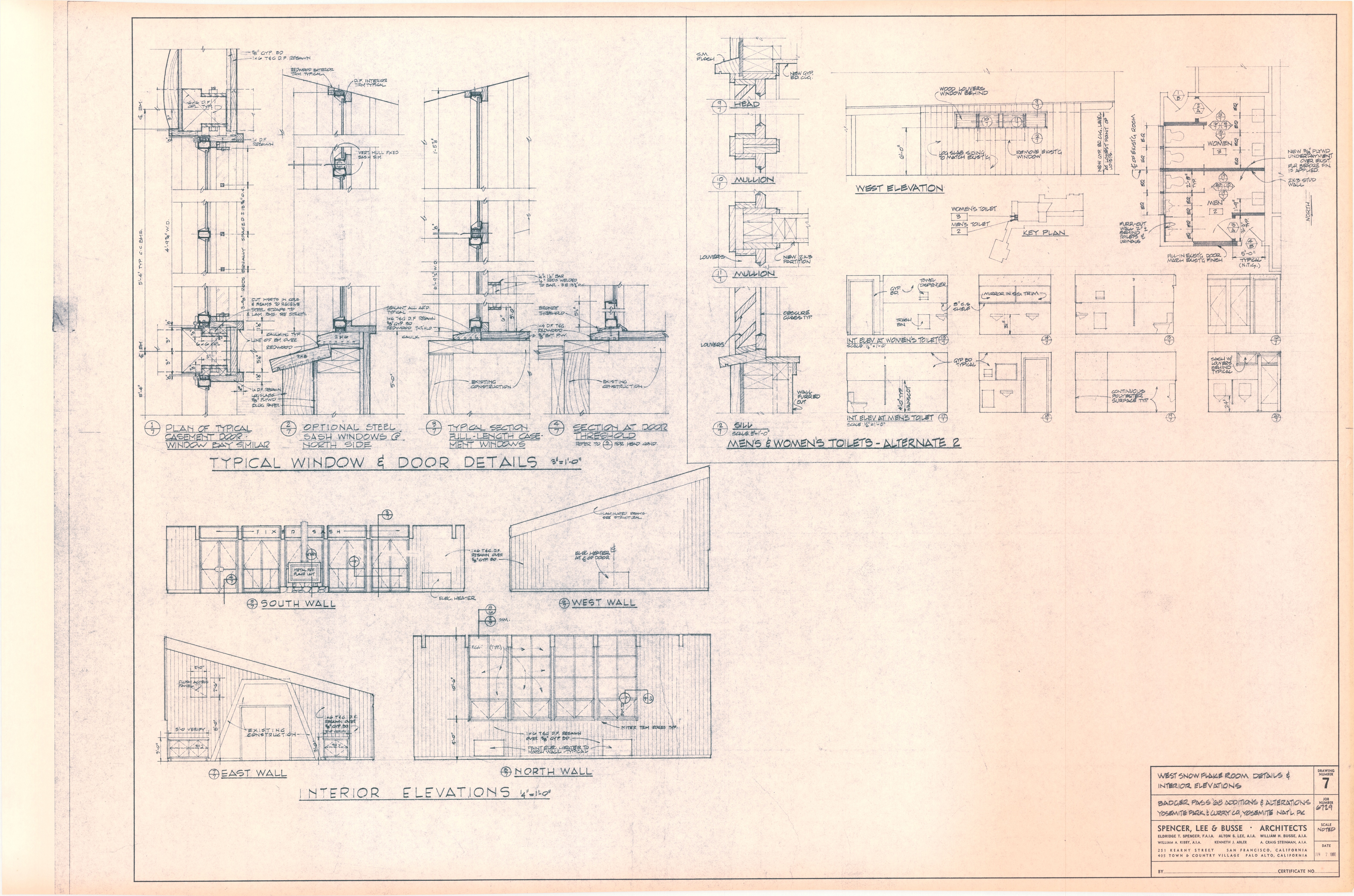 Architectural plans for the renovations & additions to Badger Pass for the Yosemite Park & Curry Co. including typical window & door details, interior elevations, men's & women's toilets alternate 2, job no. 6729, sheet 7