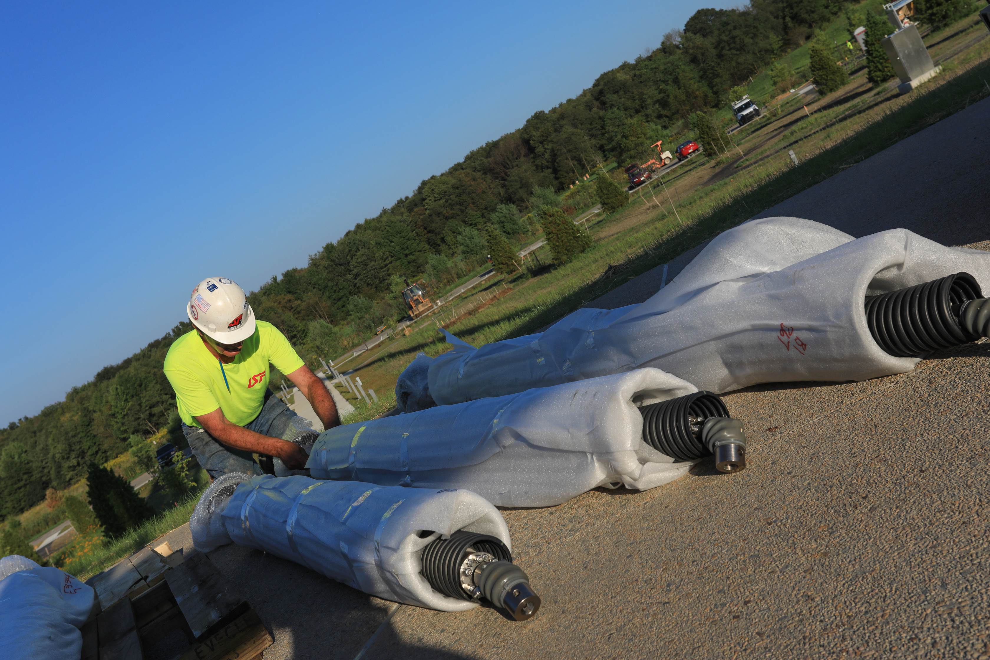 Man in bright green shirt and hard hat examines three long metal tubes covered in foam for protection, with trees and blue skies in the background.