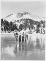Administrative Collections: Album 7 (Winter Scenes) -Ranger Sterling Vaughn, Josephine Barton, and Superintendent and Mrs. John Preston ice skating on Lake Helen.