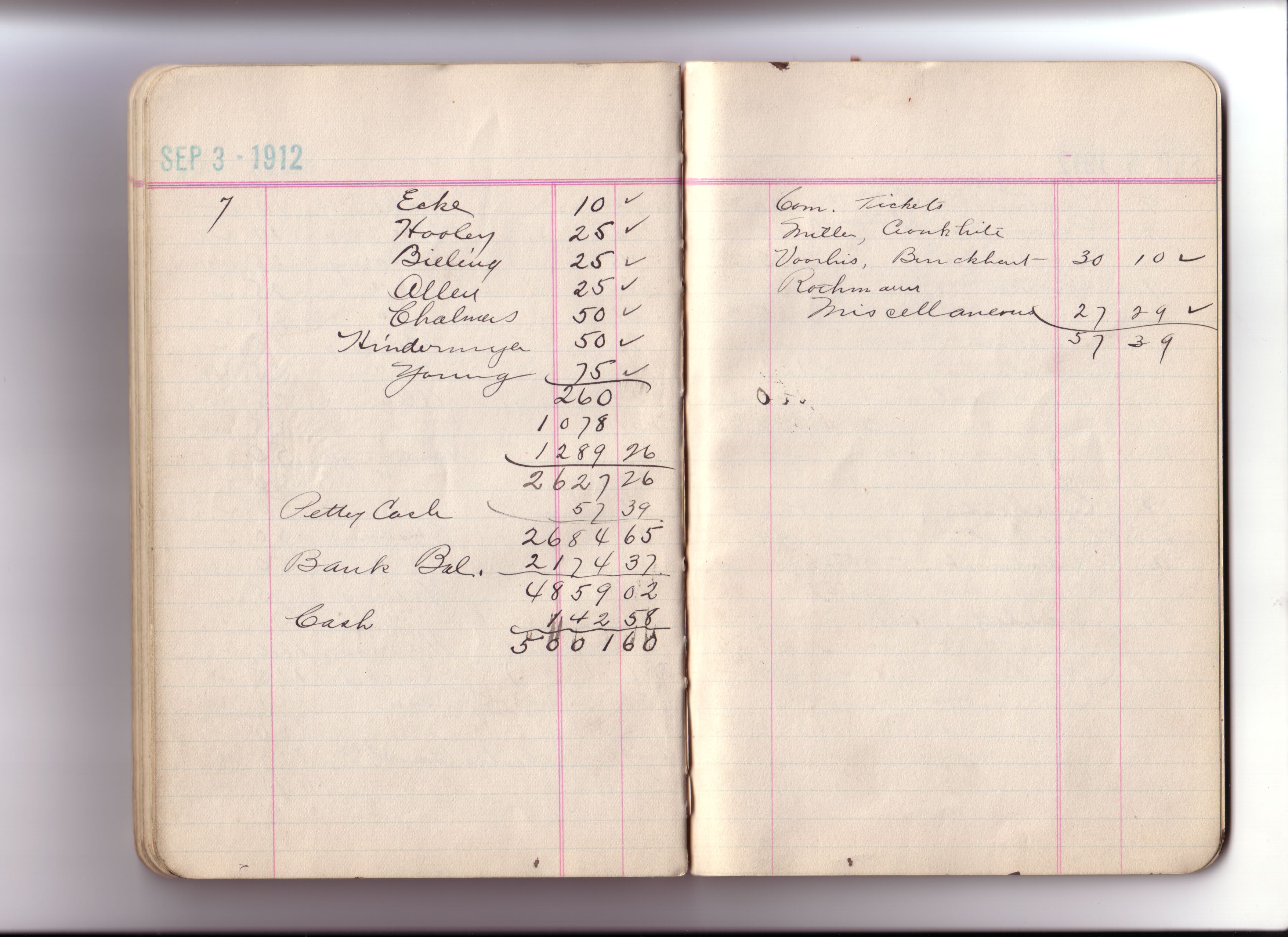 Some of the markings made in pencil in these cash books were made by ENHS Curator Leah Burt during the 1970s and/or early 1980s. For Leah Burt handwriting examples see pages for: December 19, 1921 (cash book 17) ; February 12, 1923 (cash book 17) ; October 27, 1924 (cash book 18) ; December 01, 1925 (cash book 19).