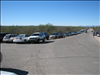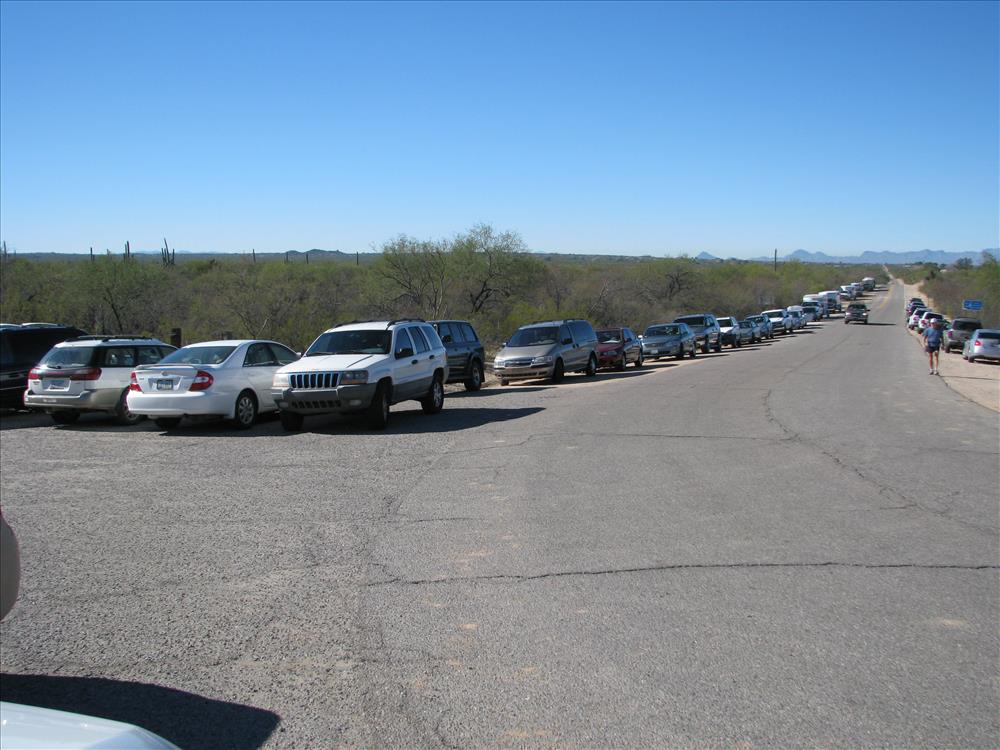 Westbound view of Speedway Blvd. from northeast corner of trailhead parking lot; shows extent of vehicles parked along road