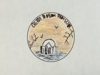 Circular watercolor painting of the Jefferson Memorial with water below against a background of yellows and browns. Two cherry tree branches with small blossoms come into the foreground from right and left. Small black v-shaped birds fly above the memorial. Handwritten text around the top of the circle reads Cherry Blossom Protector