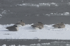 Four Canada geese are sleeping on ice in the river.