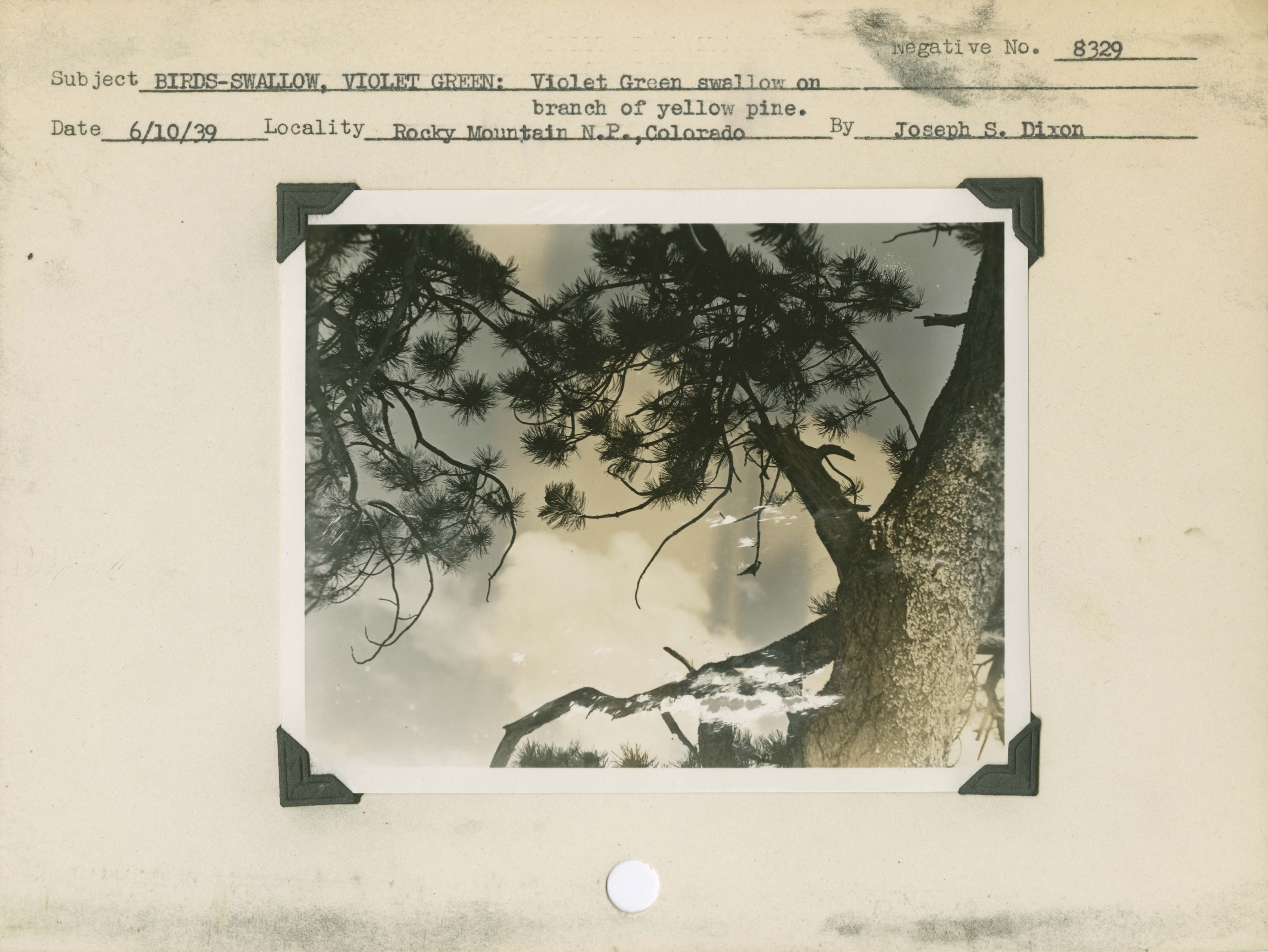 Birds- Swallow, Violet Green: Violet Green Swallow on branch of yellow pine. Locality: Rocky Mountain National Park, Colorado. Negative #: 8329