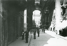 People walking and standing on a paved European city street.