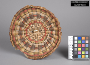 Dome shaped lid based on a frame work of twigs or small vines interlaced with dyed reeds. Shape is roughly circular except for one edge which appears to have been chew away by mice. Colors red, green, black and white have been used to decorate the lid. White color has been applied to the lid, other colors are stained into the reeds.