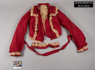 Maroon, cotton, gabardine like material coat. One inch lace trim on front, cuffs and yoke. Sacque lined with tan cotton material. 22" yoke with 4 points. Sleeve length 25", waist measurement 28 1/2". Collar is attached 2" wide and 13 1/2" long with three hook and eyes. Sacque has nine staves. Thirteen hooks and eyes down front. Belt is attached to the back and is 31" long, 1 3/8" wide. Four rows of stitches the length of the belt. Measurement down back seam, exclusive of yoke 15".
