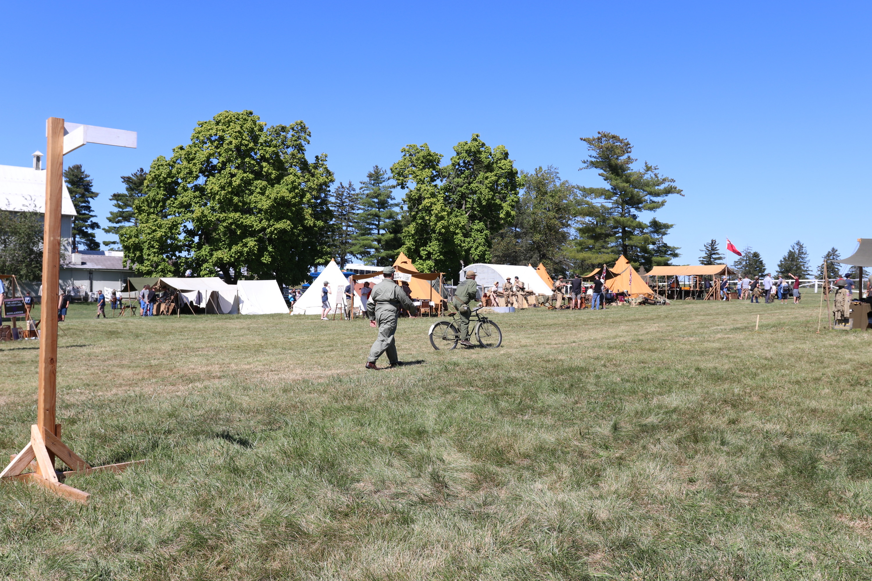 Living history volunteers riding a bike and walking through the living history camp.