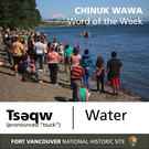 Photo of people standing by the banks of the Columbia River, accompanied by the word "tsәqw" and its translation.