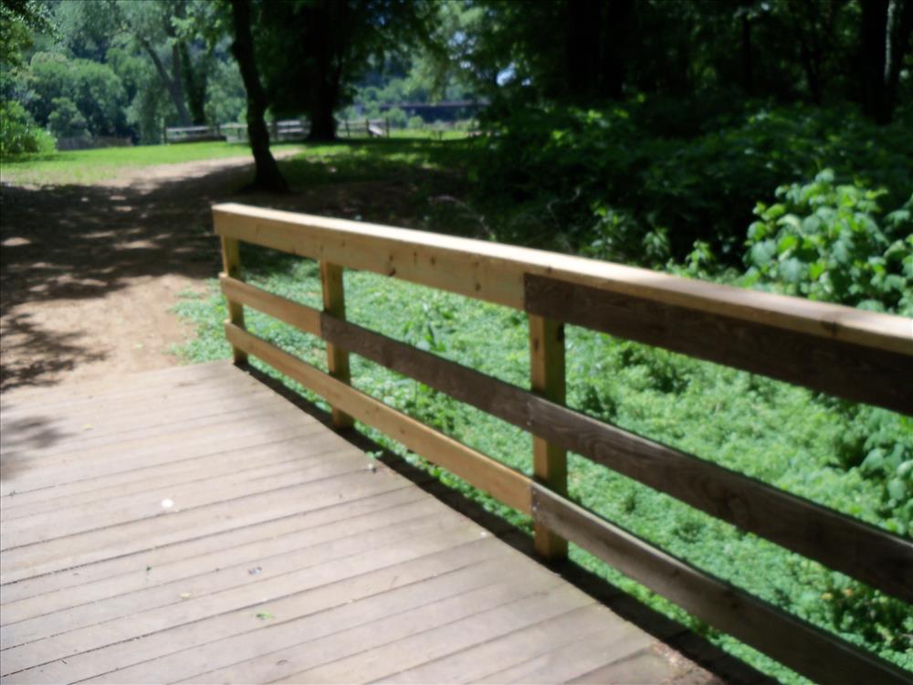 The photographic images, taken in March of 2013, show the work performed during 2010 - 2012 by HAFE Park Day Labor, to repair pedestrian bridges; clear vegetation, shrubs, trees, and stumps; stabilize grounds, dirt roads, and pathways; and improve site drainage at Maryland Heights and at Virginius Island.