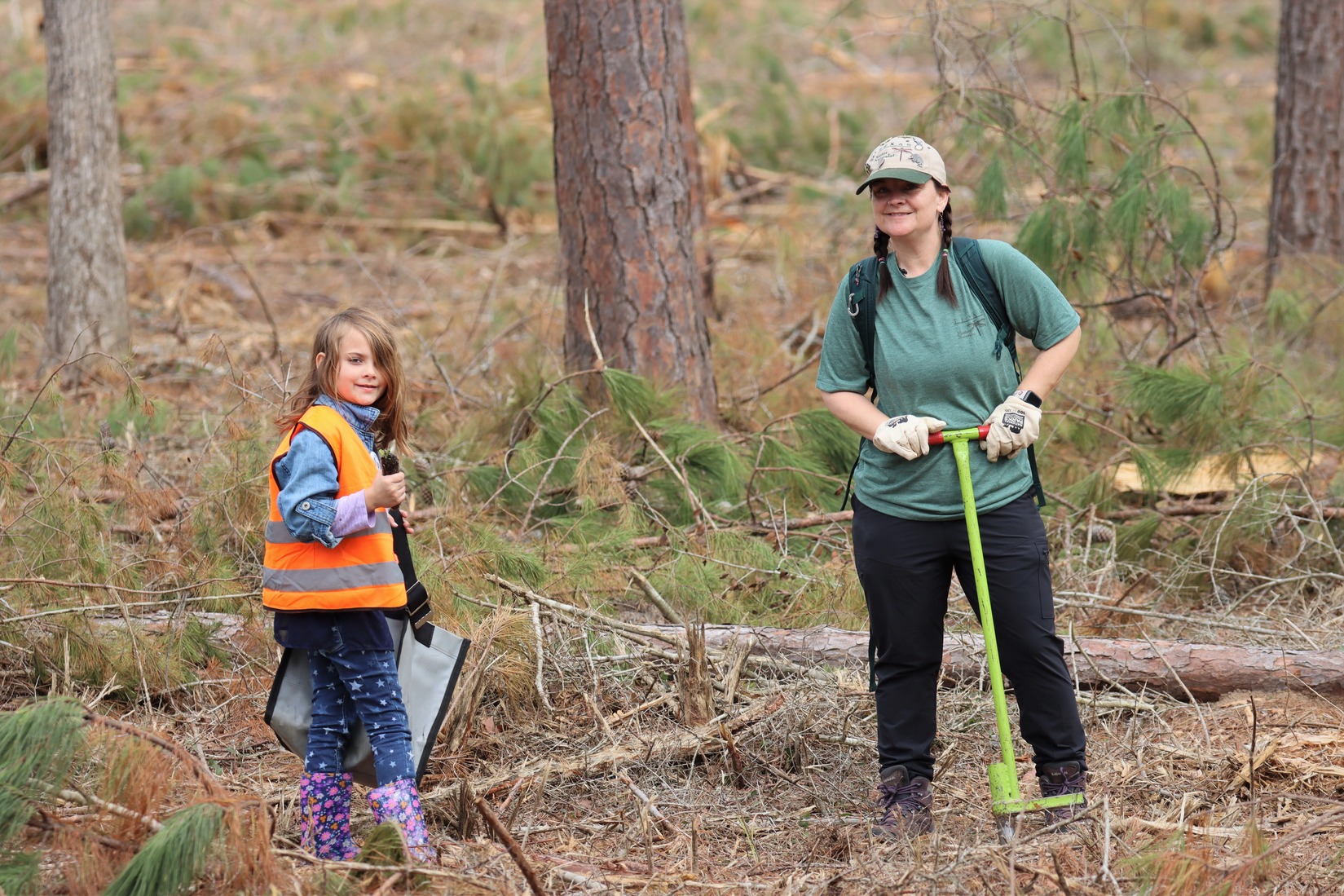 Mother and daughter planting native grasses in a future longleaf pine forest