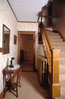 Hallway with staircase on right. Tan damask pattern wallpaper, wooden trim, banister, and newel post. A black candlestick style phone stands on a hall table in front of mirror.
