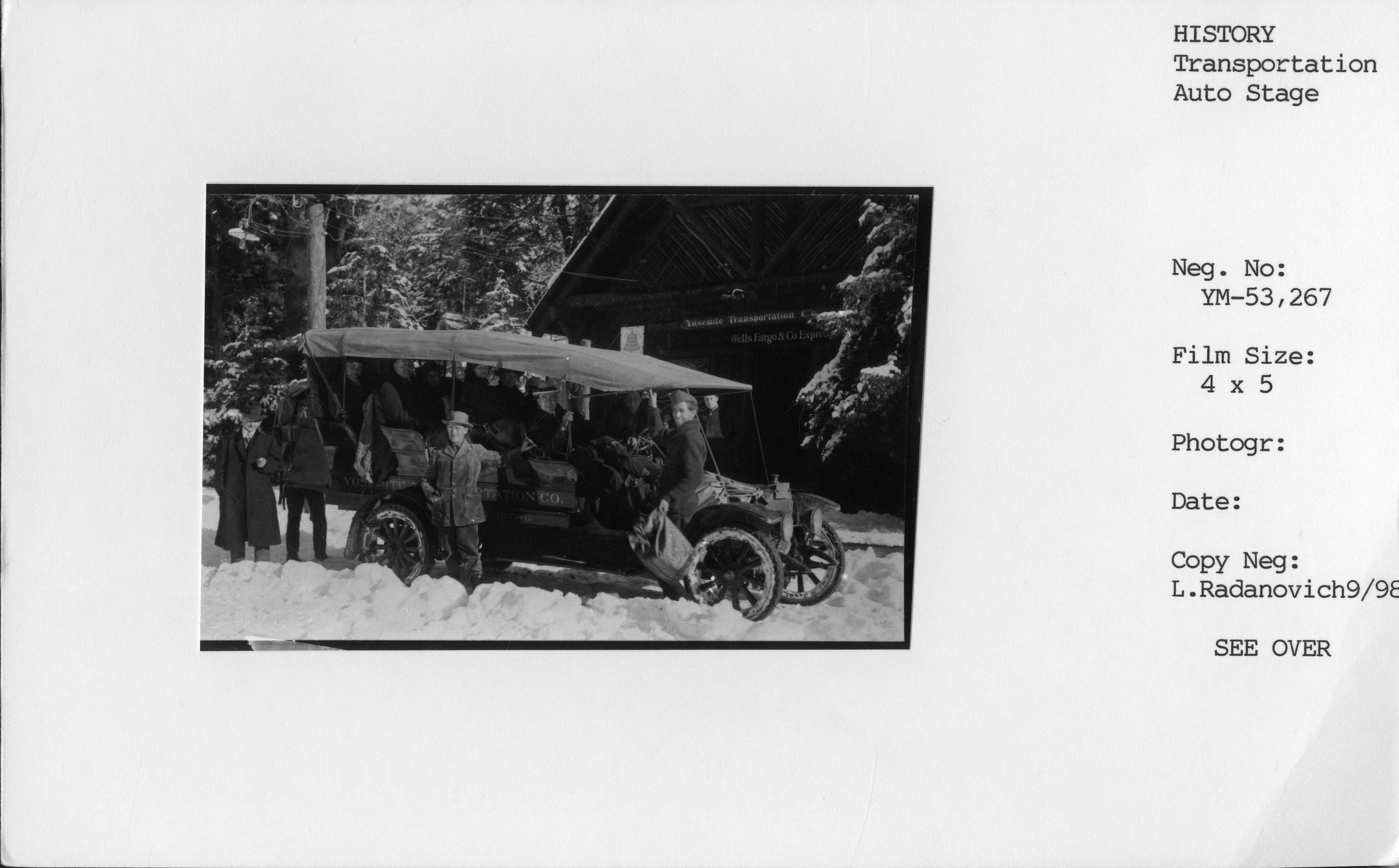 Copy Neg: Leroy Radanovich, December 2001. Auto stage ready to leave Camp Curry. Mother Curry in white on the left.