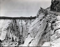 Cliff where visitor fell and was killed on October 10, 1965, just north at first drainage in cliff above Watchman Residential Area. Ranger in photo. ; ZION Museum and Archives Image 107_04_011 ; ZION 8439