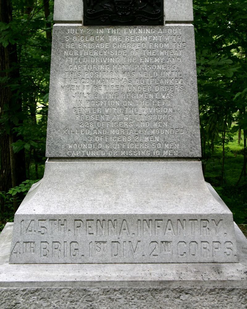 1 of 110 mns in Park to Pennsylvania commands in Gettysburg Campaign. Marks position of 145 PA when driving Confederates of Kershaw's Brigade from edge of Wheatfield to point beyond this position. Located on NE side of Brooke Ave in Rose Woods. || MN & 2 Flank Markers. Hammered base, 6'5" sq. Shaft, 3'4"x2'4", topped w/ statue of infantryman w/ musket. All 10'9" high. Inscriptions incised on shaft & State coat of arms on S. Flank markers, 1'x1'x1'6", flat-topped w/ inscription on face.