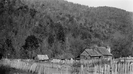P690e. SHEN 02357. Photographer George C. Knox. Mountain Homes, Historic Homes, Mountain Residents. Seldon Dodson home, lower right corner. Picket fence paddock, foreground. Shed-like structure, inside paddock, lower left side of image. Forested slope, background. Location listed as Richards Hollow.