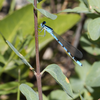 A blue damselfly with black stripes on its abdomen and wings folded against its back clings to a plant below a leaf.